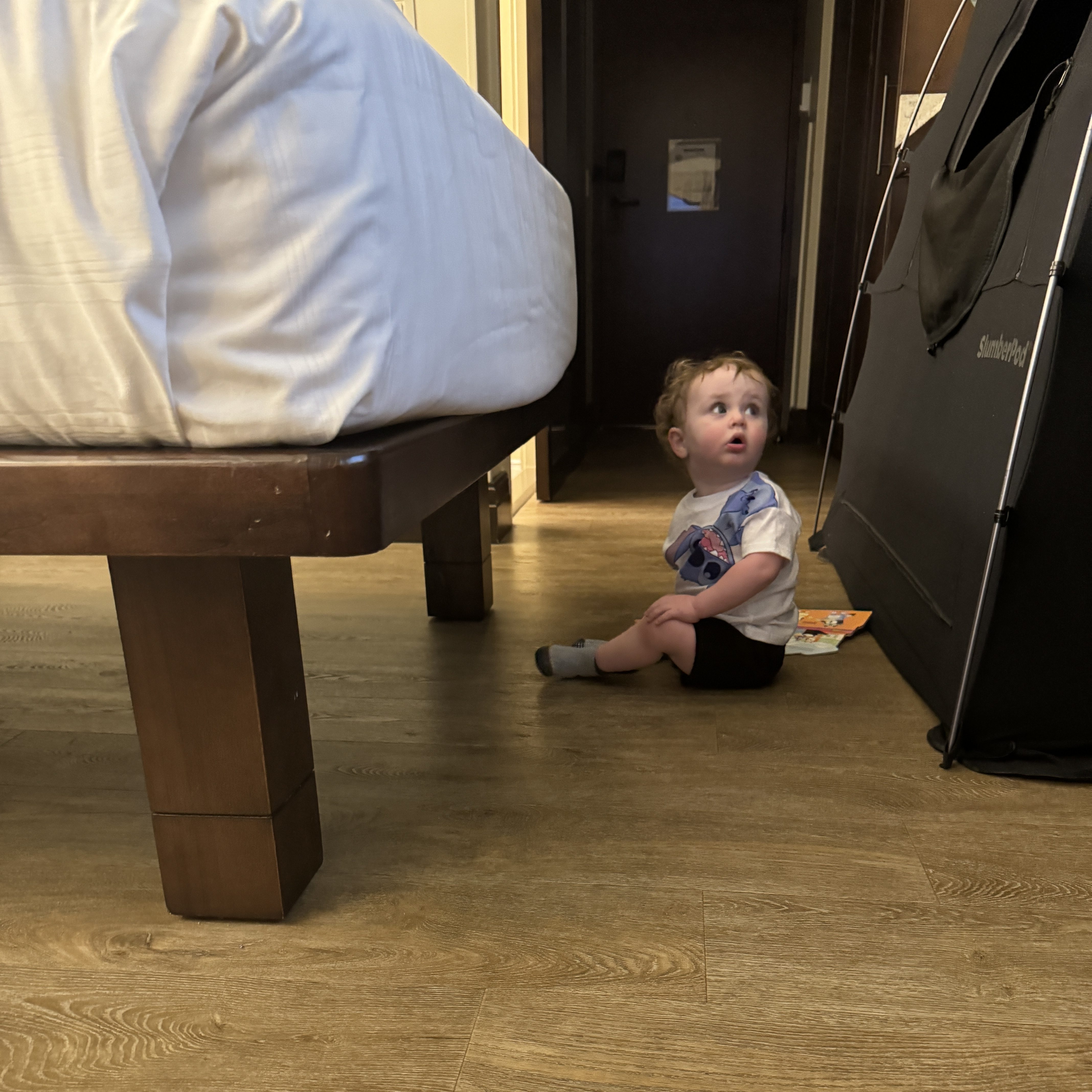 - The height of the beds allowed for suitcases and storage under the bed. The room we were in was a fair size, but could be cramped with many suitcases and additional items needed for traveling families (Strollers – looking at you) – but the additional storage under the bed makes life easy for families. Photo below for a height comparison with my kid. Those with crawlers may actually be a little worried since Nolan could definitely fit under there if he wanted.
