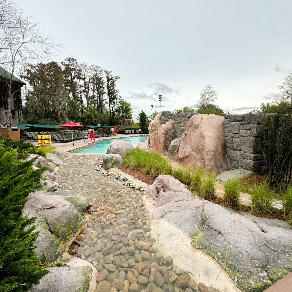 The falls fill the Copper Creek Pool, complete with slide and kids splash zone. Wilderness Lodge has an additional pool elsewhere on property, the Boulder Ridge pool.