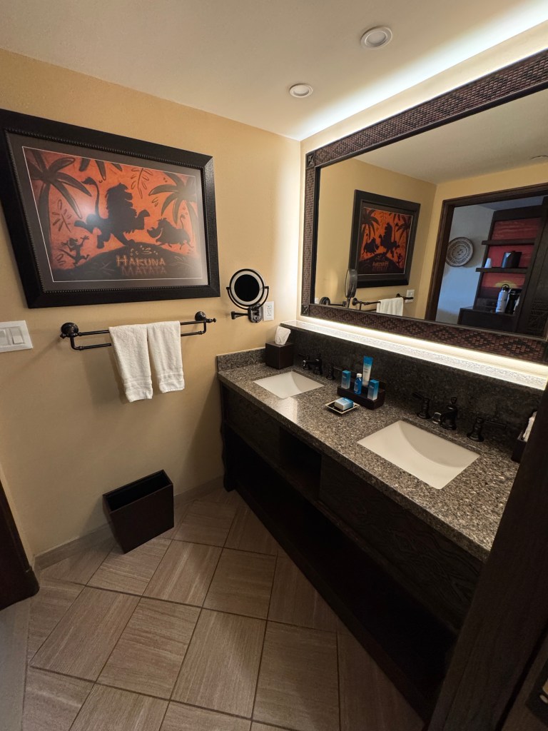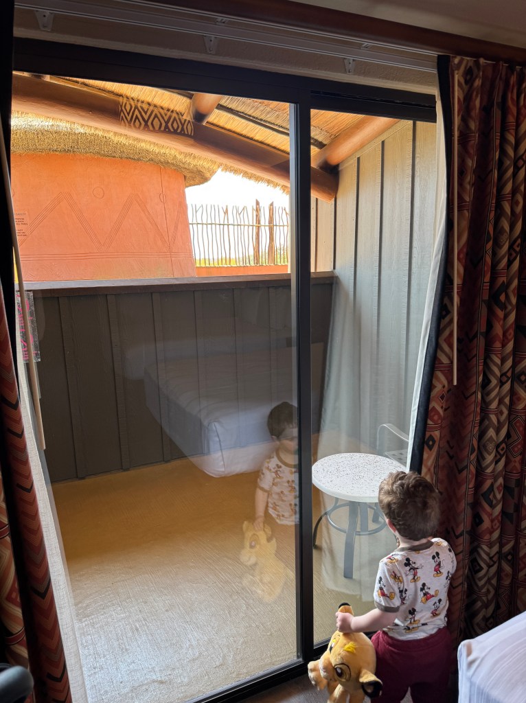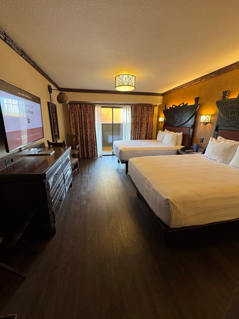 We stayed in a standard resort view room with two queens in Jambo House and had a view of the roof. All rooms have a patio of sorts with two chairs and a small table – which is such a nice feature of Deluxe Resorts (even if you are just looking at a roof).