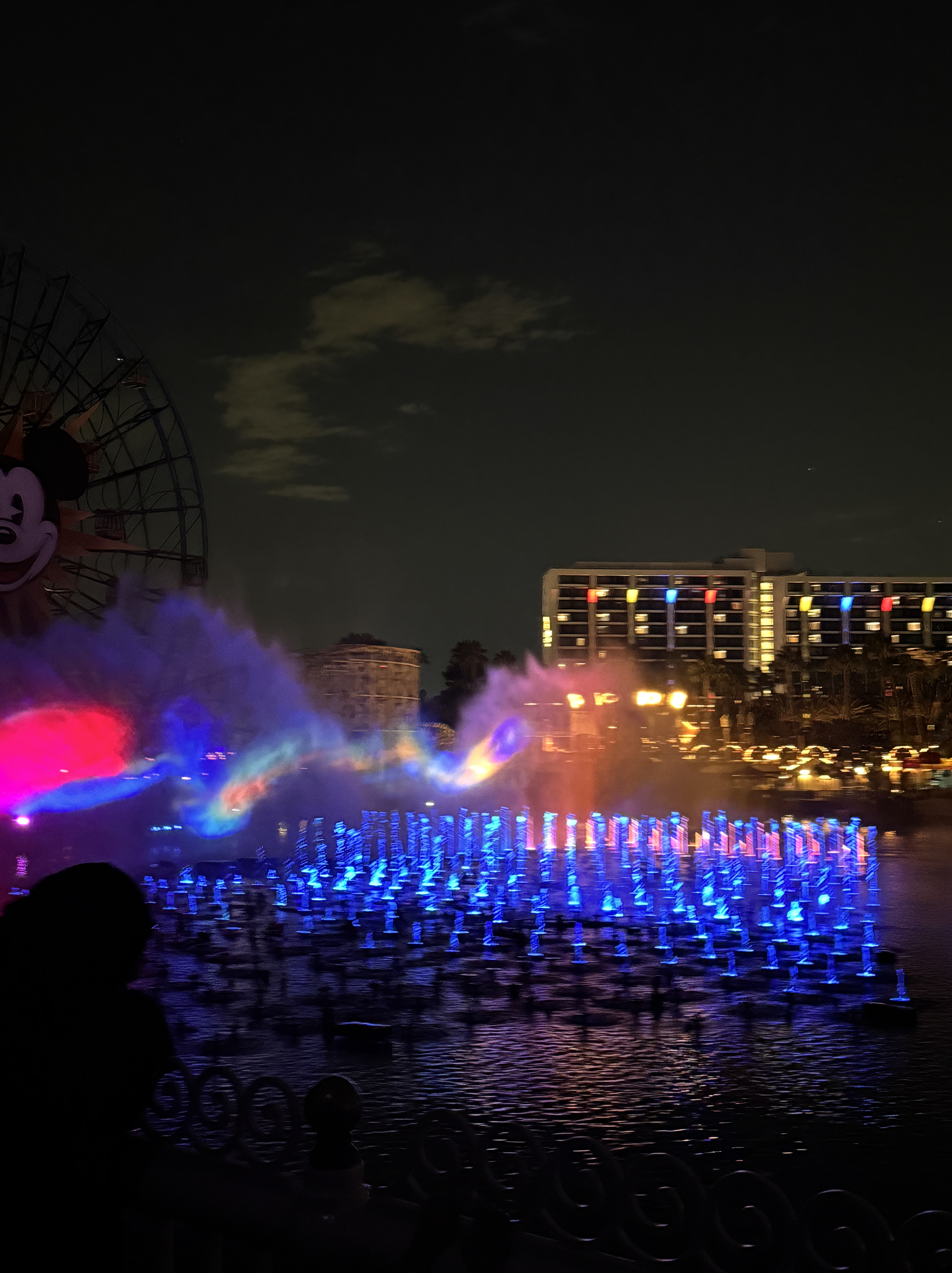 - Walked over to find a spot for the 9 pm World of Color on Pixar Pier. This is the nighttime show at California Adventure that is a mix of water and projections. We had a decent view of the show, but the audio was not great in our spot. If possible, use the virtual queue or do one of the dining/dessert parties for best views.