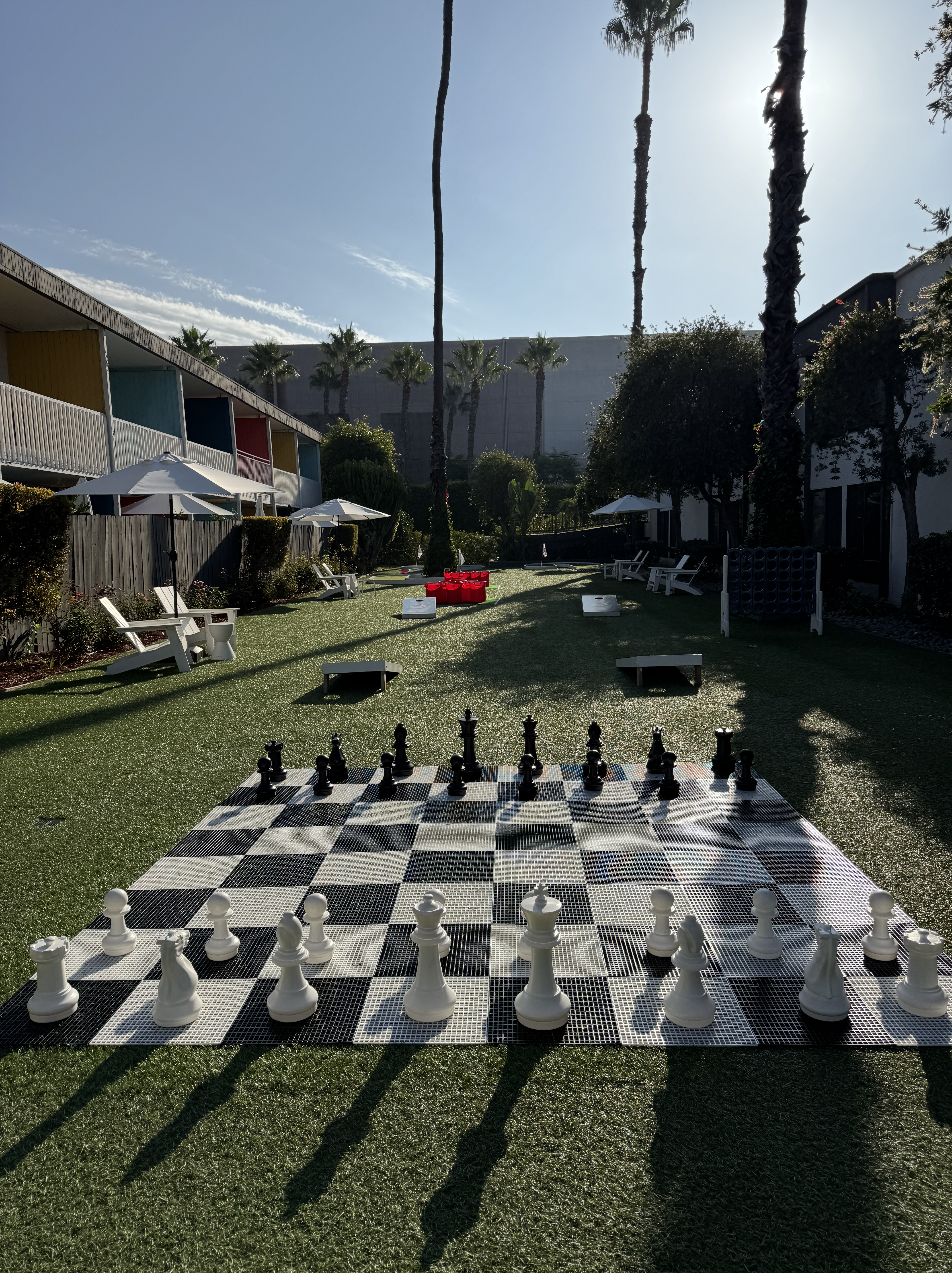 - Beautiful property with so many amenities! The pool is large and heated, there is a yard game area, a café patio, couches with fire pits, a Top Golf simulator suite.